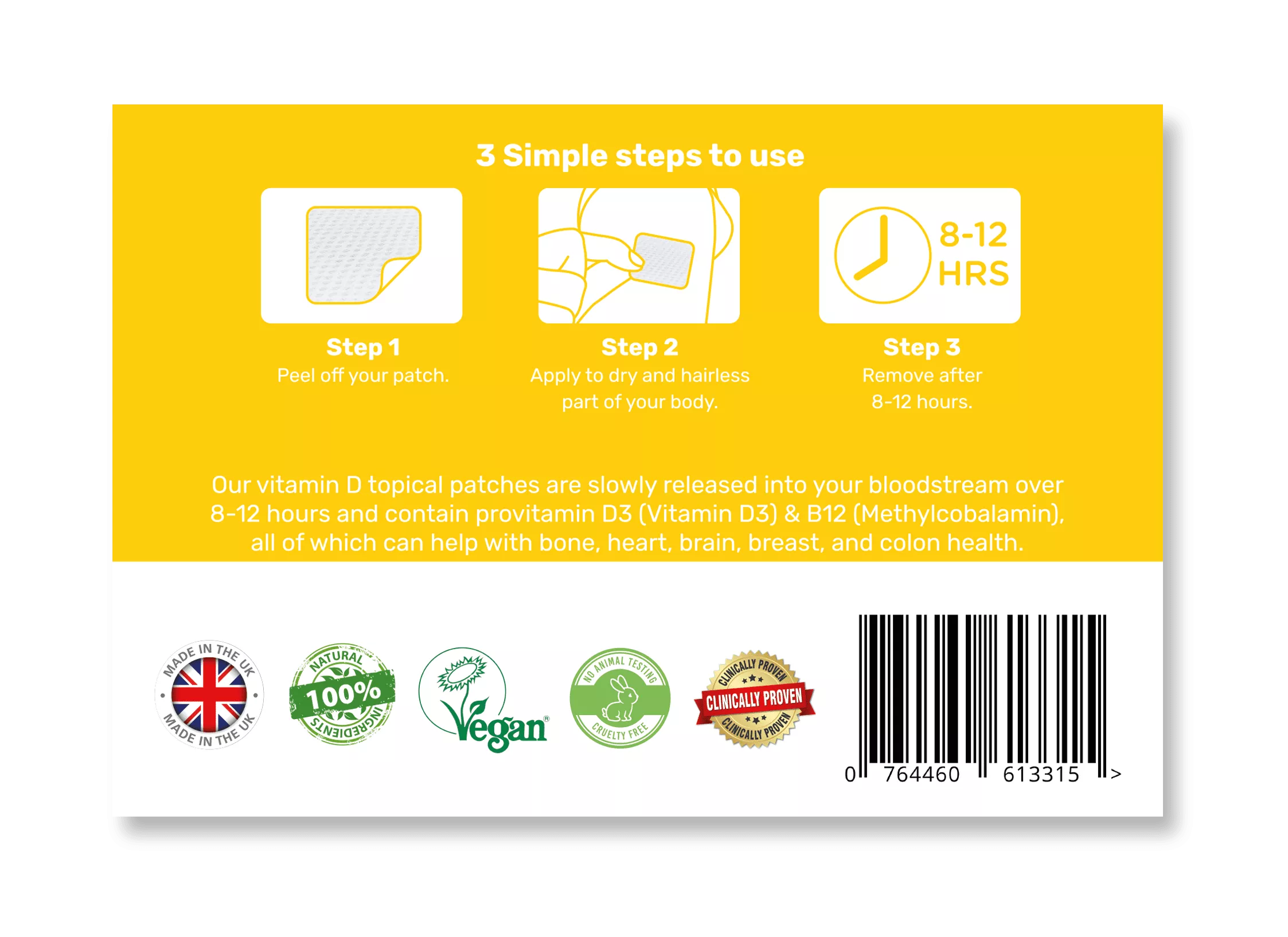 Our bodies naturally produce Vitamin D when exposed to UV sunlight, as we get older our bodies ability to manufacture Vitamin D decreases. Vitamin D Topical Patches contain Provitamin D3 (Vitamin D3) & B12 (Methylcobalamin), all of which help with bone, heart, brain, breast and colon health, can help with bone health/strength and could help prevent osteoporosis, diabetes, migraines, pre-menstrual syndrome, relives anxiety and a healthy heart.